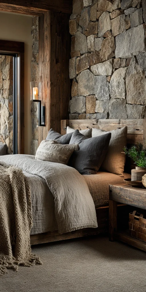 Incorporate stone through a fireplace surround if you have one, or use stone tiles or a stone feature wall in natural grays and tans. Dress your bed in soft, rumpled linen bedding in gentle colors like lavender-gray, sage green, or buttercream. Layer multiple pillows in linen shams and add a linen throw folded at the foot of the bed.