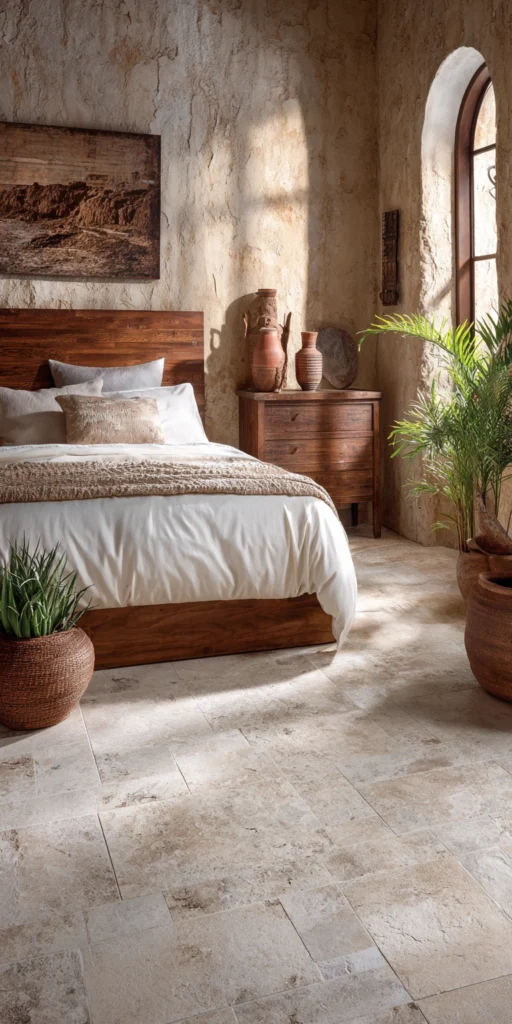 Capture the stark beauty of desert landscapes with pale stone and bleached wood. Install tile or stone flooring in warm sand tones—buff, cream, or pale terracotta. Choose a low-profile bed frame in light-colored wood with clean, simple lines that reference desert minimalism.