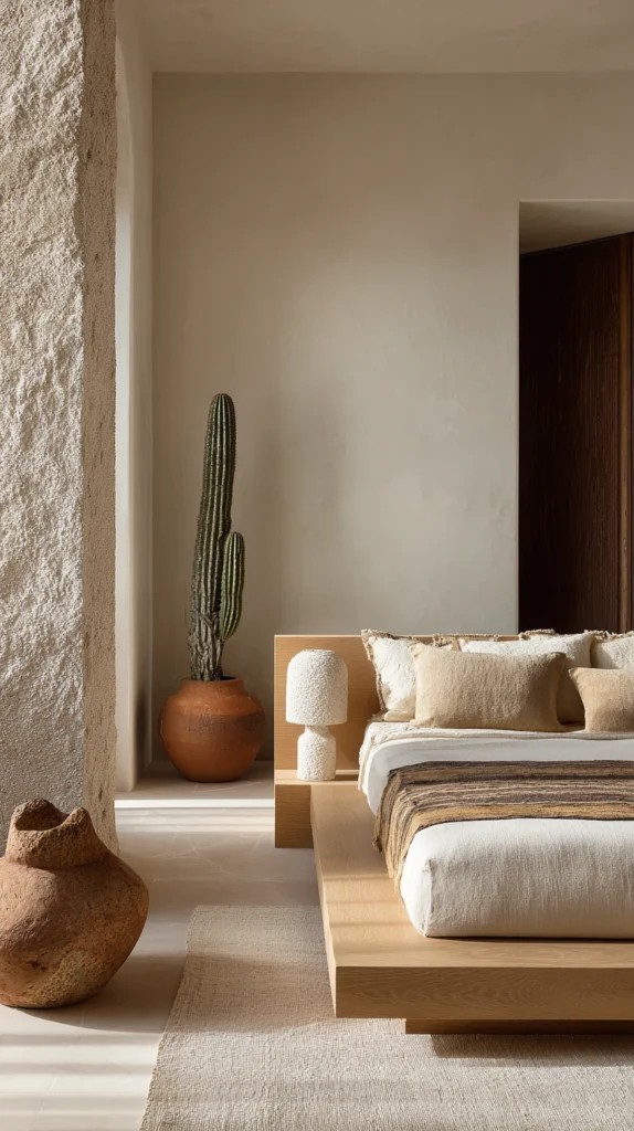 Incorporate stone accents through sculptural pieces—perhaps a smooth stone lamp base or decorative stones in warm tones of amber, rust, and cream. Install simple wooden floating shelves to display succulents and cacti in terracotta pots. Keep the color palette warm but pale, with plenty of natural light. The room should feel spacious, calm, and touched by golden sunshine.