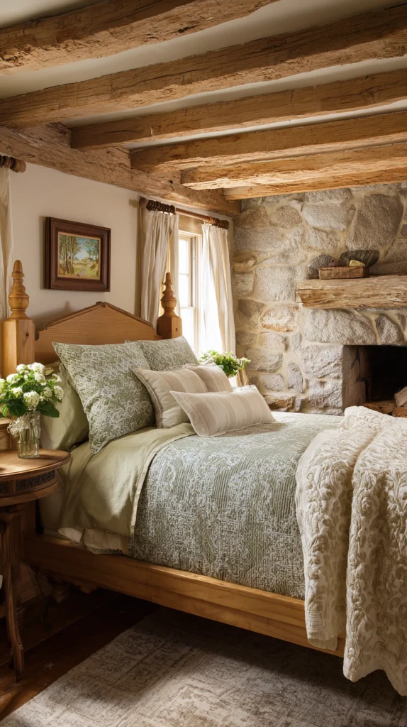 Create a cozy cottage bedroom using honey-toned woods and natural stone accents. Choose furniture in warm oak or pine with a slightly aged appearance—perhaps with gently distressed finishes that suggest years of use. A wooden bed frame with gentle curves or simple carved details adds cottage character without being overly ornate.