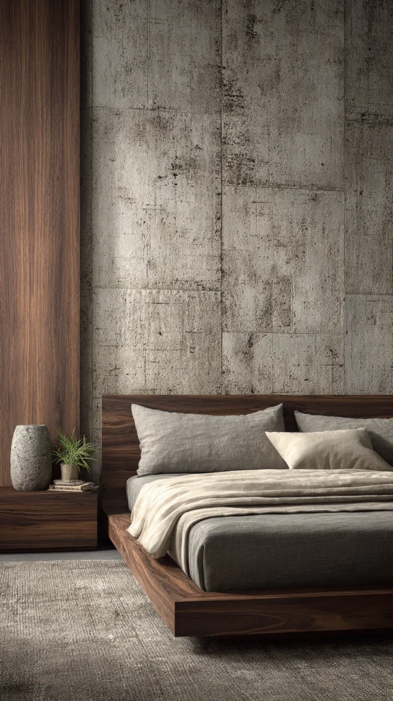 Blend contemporary design with natural materials for a sophisticated yet earthy bedroom. Choose sleek wooden furniture in rich walnut or teak with clean lines and minimal ornamentation. A platform bed with a wooden frame and integrated nightstands creates a streamlined look while showcasing beautiful wood grain.