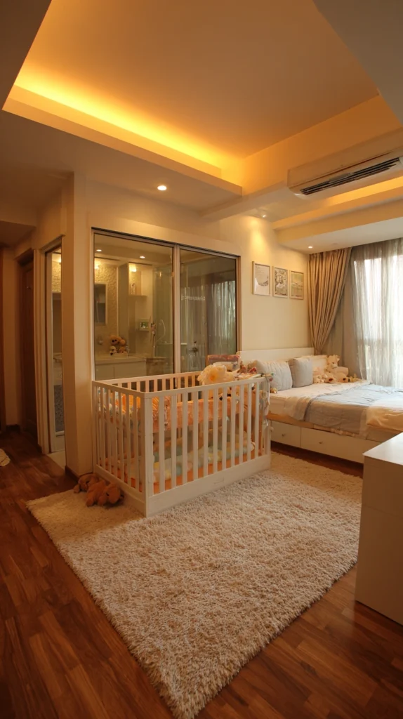 Use area rugs defining baby zones visually, position furniture creating subtle barriers between zones, or arrange to maximize parents’ ability to monitor babies while maintaining some spatial separation. The defined zoning creates organizational clarity while ensuring both occupants have designated territories within shared spaces.