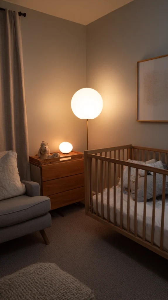 Add clip-on reading lights above changing areas providing focused illumination, install dimmer switches on overhead fixtures allowing ambient adjustment, position nightlights near bassinets enabling baby checks without disturbing sleeping partners, and perhaps include smart bulbs allowing color temperature and intensity control via smartphone apps. The layered lighting addresses diverse nighttime needs while allowing appropriate illumination for each specific activity preventing harsh overhead lights disturbing sleeping occupants unnecessarily.