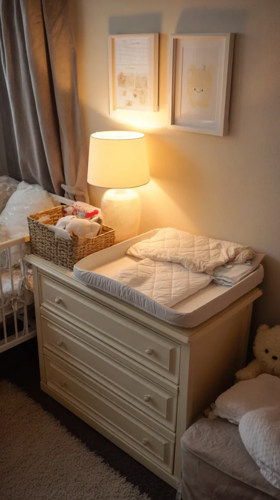Position changing areas near adequate storage ensuring supplies remain conveniently accessible without requiring excessive reaching or movement during changes. Include proper lighting ensuring visibility and safety during nighttime diaper changes when exhaustion and darkness create challenging conditions.