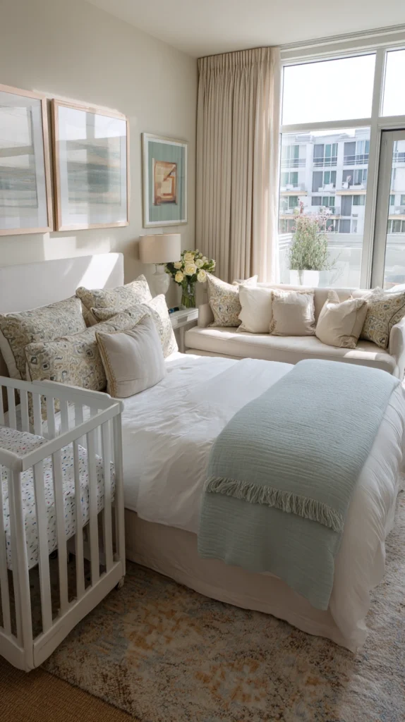 Thoughtful design incorporating space-efficient furniture, visual separation between adult and infant zones, and aesthetic cohesion maintaining bedroom tranquility transforms potential challenges into workable arrangements.