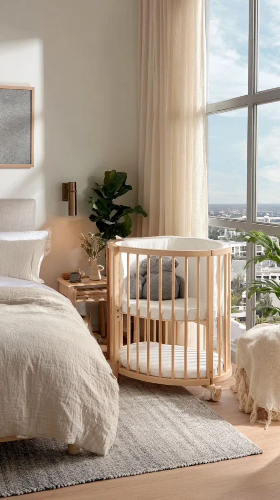 Select nursery furniture and accessories in finishes and styles matching existing bedroom décor creating cohesive unified spaces rather than visually jarring nursery insertions into adult bedrooms. Choose baby furniture in wood tones matching bedroom sets, select neutral bassinet fabrics coordinating with bedding colors, and avoid obviously juvenile nursery themes maintaining sophisticated adult bedroom atmospheres.