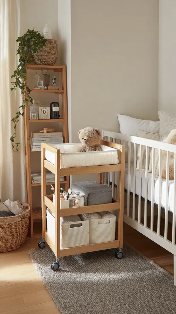 Incorporate wheeled storage carts containing essential baby supplies that roll between bedroom corners and bathrooms creating flexible mobile nursery stations adapting to changing needs and limited permanent space. Load carts with diapers, wipes, clothing, feeding supplies, and other frequently needed items, position conveniently during active use periods, and roll into closets or corners when not needed clearing floor space.