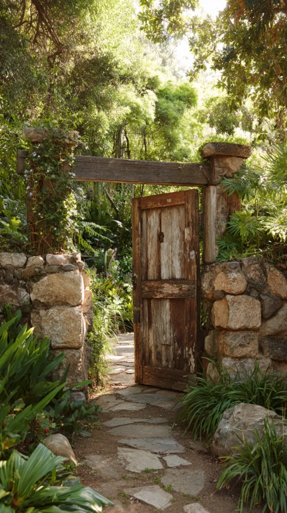 The history embedded in a weathered timber door — the worn paint, the original hardware, the grain of wood that has absorbed decades of weather — gives it a character and a presence that no new garden ornament can replicate.