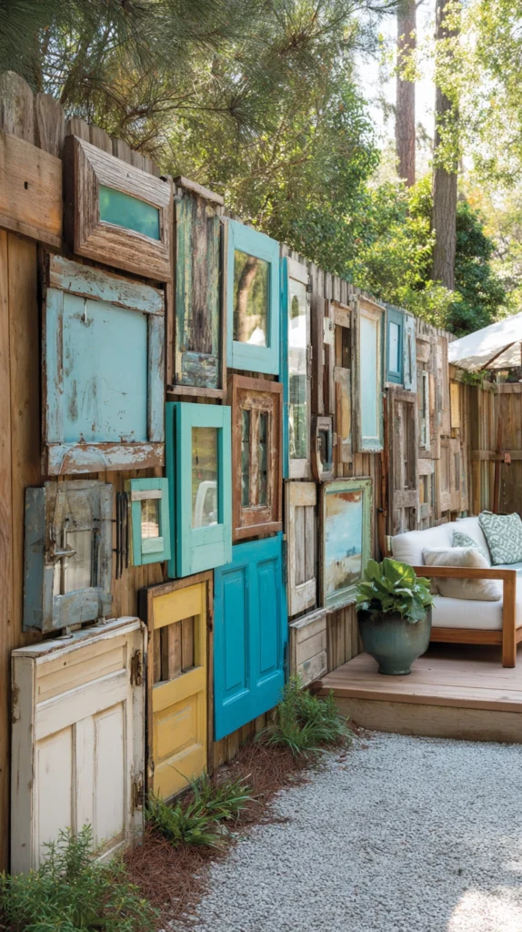 Pro Tip: Paint the old doors in the outdoor art gallery wall in a consistent color palette — either all the same tone or in a family of two or three closely related colors — to create visual cohesion across a collection of doors that may vary significantly in style, size, and original character.