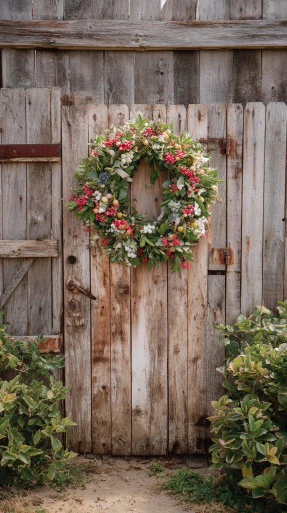 An old door installed at the garden entrance — leaning against a wall, hung on a fence, or set into a freestanding frame — and used as the display surface for a changing series of seasonal wreaths, garlands, and botanical decorations creates a garden feature that evolves with every season and provides a reason to engage creatively with the garden throughout the year.