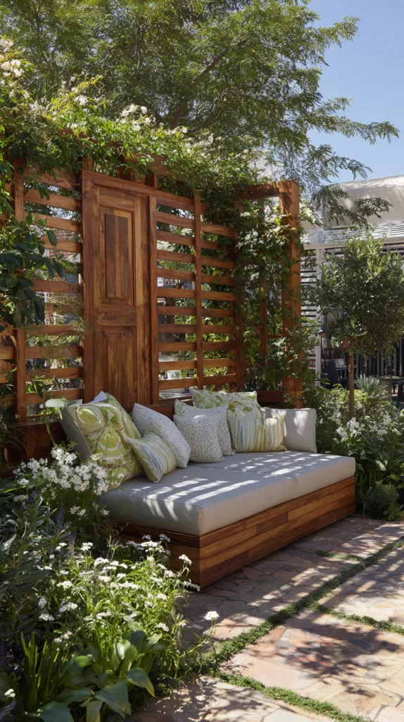 An old door used as an outdoor headboard feature — positioned behind a garden daybed, a hammock, or a pair of outdoor chairs to create a visual backing that defines the seating area and gives it the quality of an outdoor room — creates a garden living space of genuine, distinctive character. The door headboard provides the vertical element that transforms an open seating arrangement into a defined, enclosed outdoor room.