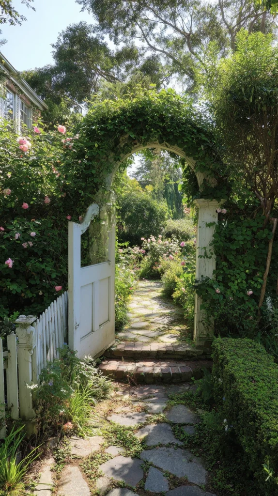 A door frame arch half-consumed by climbing roses or clematis after several seasons of growth is one of the most beautiful garden features that time and patience can create.