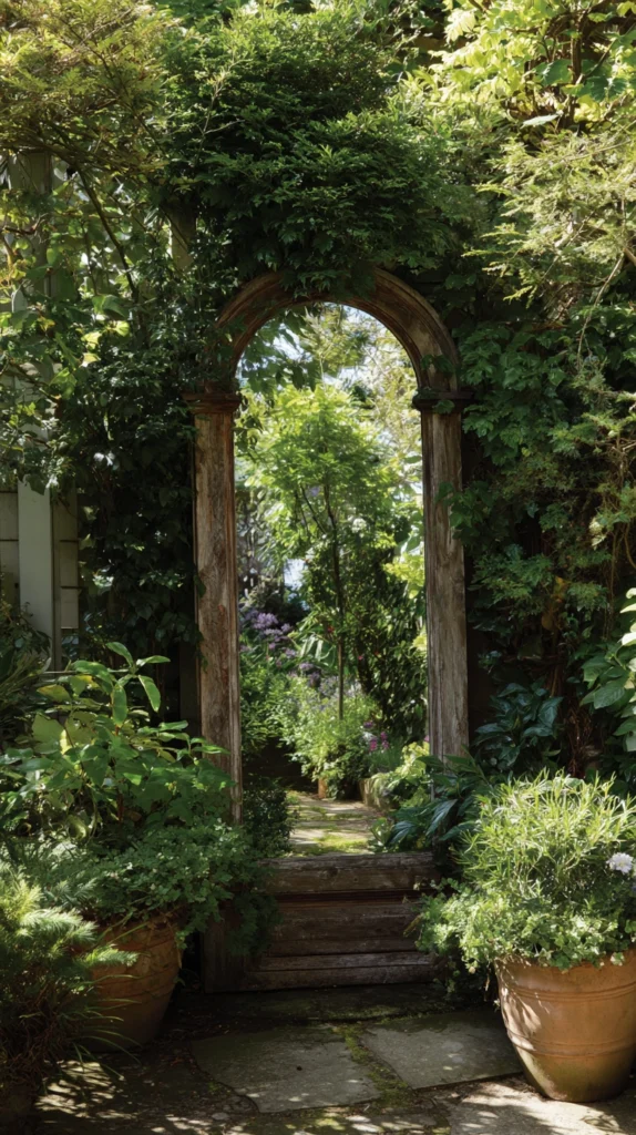 Pro Tip: Plant the border or hedge immediately surrounding the stripped door frame arch with climbing plants that will grow across and through the frame opening over time — blurring the boundary between the constructed frame and the living planting and creating an installation that evolves from a clearly architectural feature into something that appears to have grown organically from the garden itself.