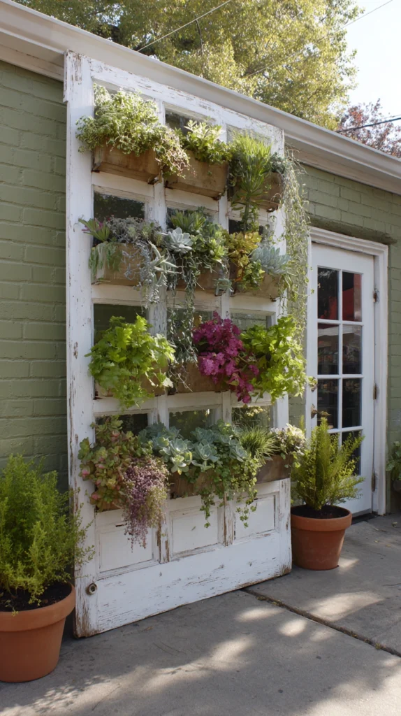 An old door laid flat on a slight angle against a wall or fence and used as a backing structure for a vertical planter display — individual pots hung from the door hardware, small planter boxes attached to the door rails, and trailing plants growing through the panel openings — creates a living wall of considerable visual impact from a single discarded object and a collection of ordinary garden containers.