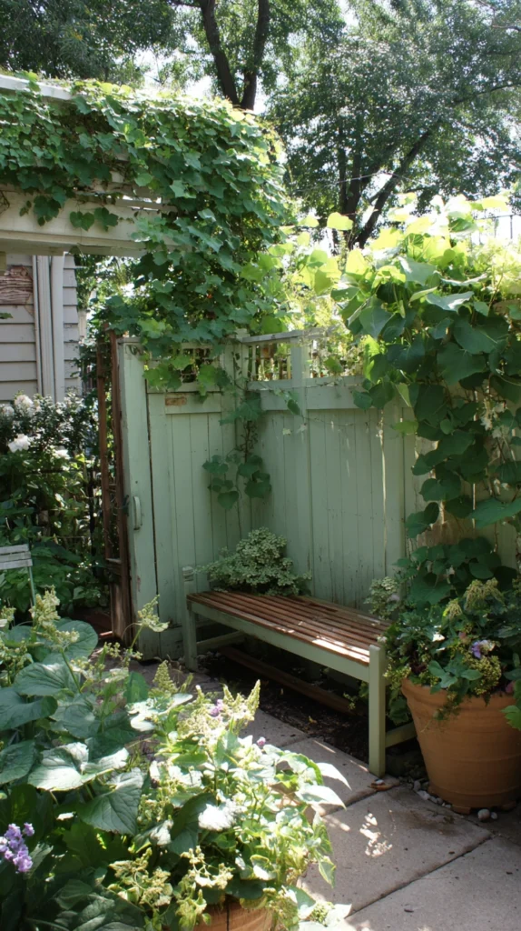 Set the doors into a simple timber frame sunk into the ground with metal post spikes — a stable, weatherproof installation that can be relocated if the garden design evolves. Paint the doors in a color that complements the wider garden palette — a deep sage green, a warm terracotta, or a deep charcoal — and allow climbing plants to begin establishing on both faces of the door divider from the first season.