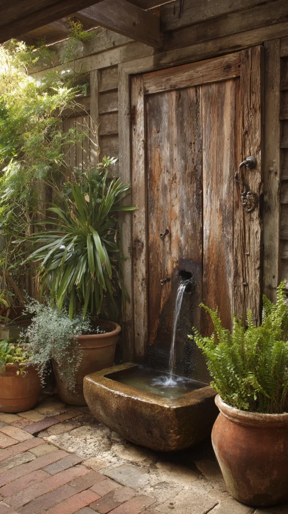 Attach a simple recirculating wall fountain fitting directly to the door surface — a lion’s head or a simple copper spout — with the water falling into a trough or basin positioned at the base of the door. The water staining that develops on the door surface over time as water splashes and runs across the timber adds to rather than detracts from the aged, weathered character of the installation.