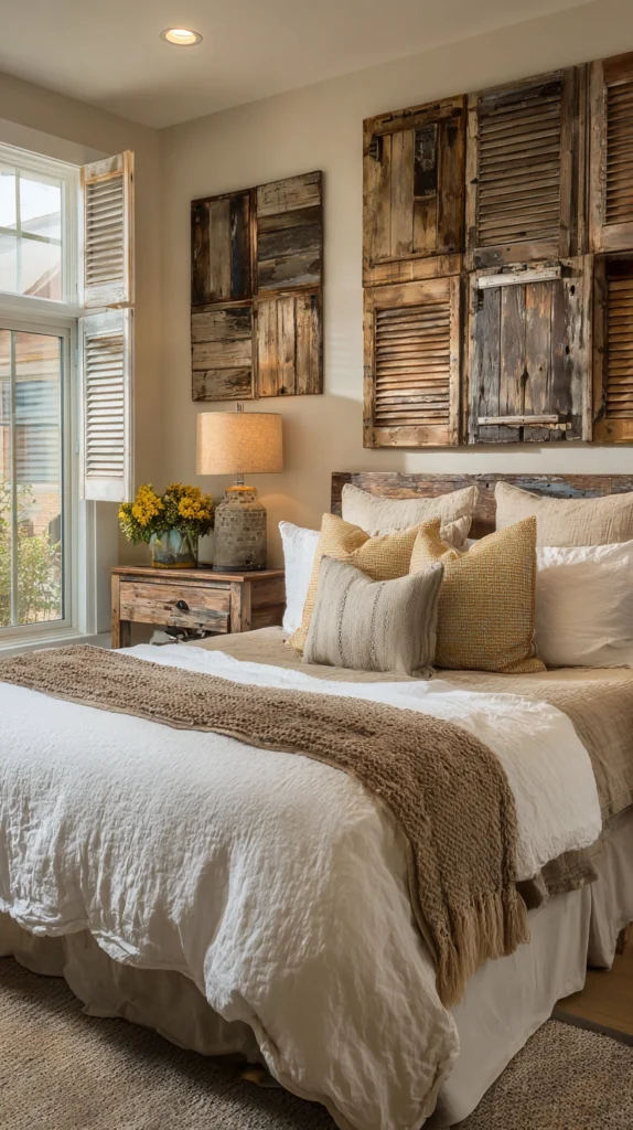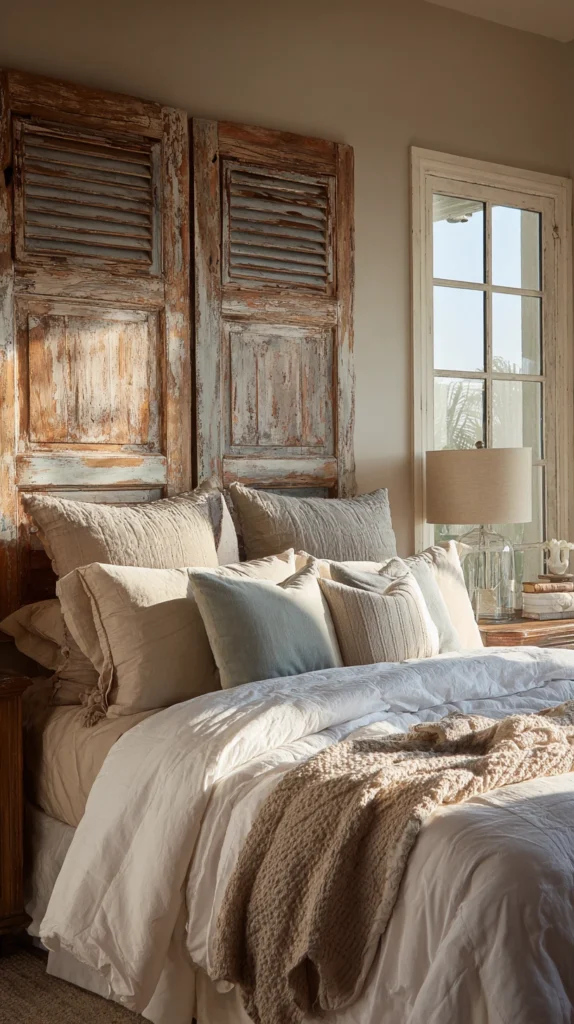 A pair of old shutters positioned behind the bed as a headboard creates a bedroom focal point of immediate character and considerable visual presence. The shutters’ louvered surface brings texture, depth, and the specific aged quality of the reclaimed material to the wall behind the bed in a way that a conventional upholstered or timber headboard cannot approach.
