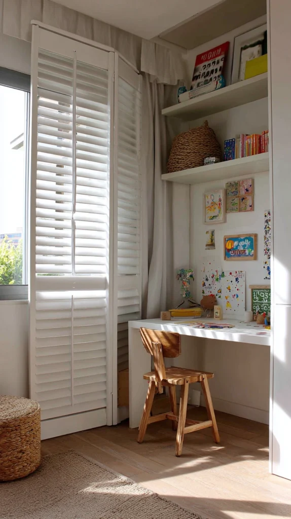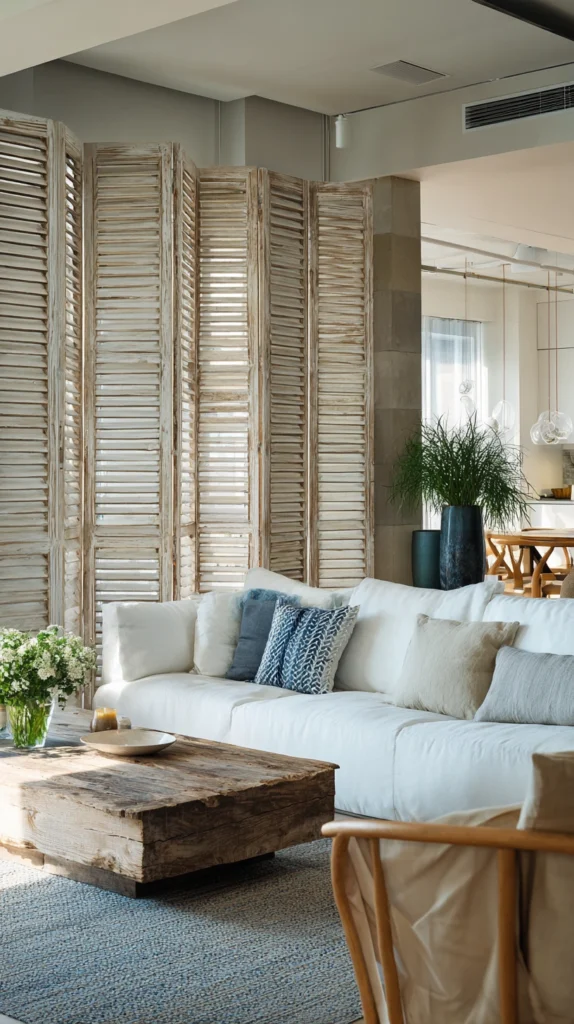 The shutter screen’s louvered surface allows light to pass between the defined zones, maintaining the sense of spatial connection across the division while creating the visual boundary that the zone definition requires. This filtered quality of the division, neither fully open nor fully closed, is one of the louvered shutter’s most distinctive and most useful spatial properties.