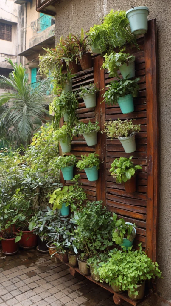 Small terracotta pots wired to the louvered slats, hanging tin cans repurposed as planters, and clip-on pot holders designed for louvered surfaces all create the planting positions that the vertical garden requires. Succulents and drought-tolerant plants are the most forgiving species for the vertical garden’s challenging growing conditions of limited soil volume and variable moisture.
