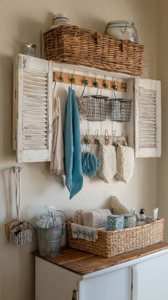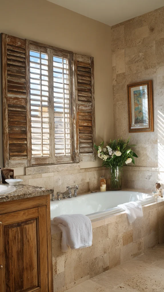 Old shutters used as a decorative wall feature in a bathroom, fixed flat to the wall above the bathtub or beside the vanity, create a bathroom of unexpected rustic character that the standard tile and mirror bathroom entirely lacks. The shutters’ louvered surface provides visual texture and aged material warmth at the room’s primary focal point.