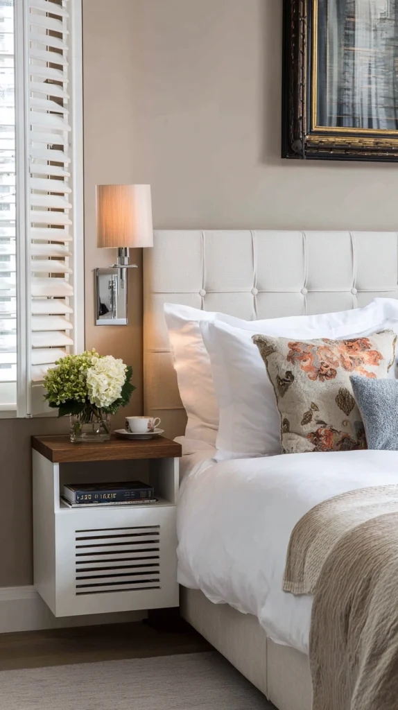 The wall-mounted shutter bedside solution is particularly effective in small bedrooms where every centimeter of floor space contributes to the room’s sense of spatial generosity. The elimination of the bedside table’s legs from the floor area, even in a space of modest dimensions, creates a perceptible improvement in the room’s ease of movement and visual spaciousness.