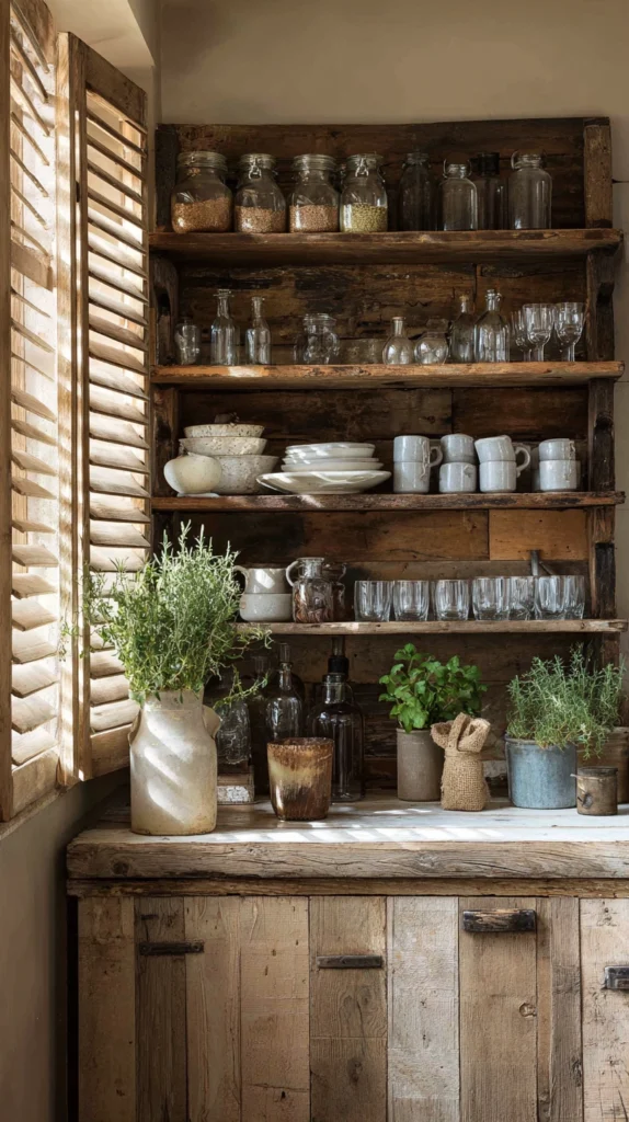 Old shutters used as the back panel of an open shelving unit create a kitchen display surface of considerable rustic character, providing the visual backdrop against which ceramics, glass, and stored food items are displayed with an aged, farmhouse quality that the plain wall or the standard cabinet back cannot provide.
