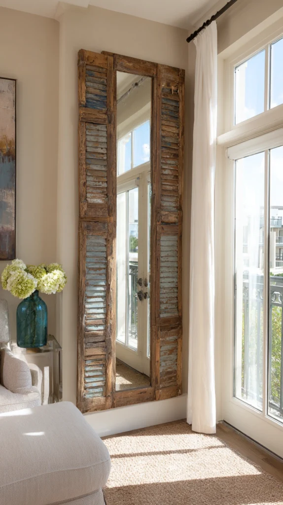 The wall color behind and around the composition should be chosen to maximize the visual impact of the shutters and mirror together. A deep, saturated wall color creates the most dramatic backdrop for the pale aged timber of the shutters and the reflective surface of the mirror, creating a composed vignette of considerable sophistication.