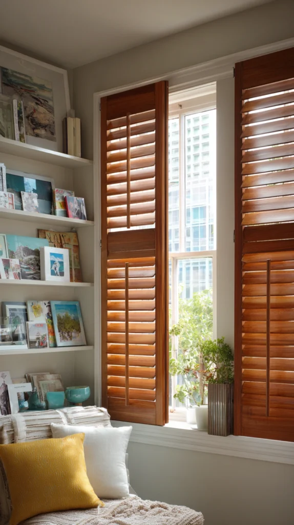 The shutters can be fixed at a slight angle to the wall, as if genuinely open on window hinges, to reinforce the window illusion and create the three-dimensional interest of a composition that projects slightly from the wall surface. This angled positioning also catches the room’s light on the louvered surface at a more favorable angle than the flat wall-mounted position.