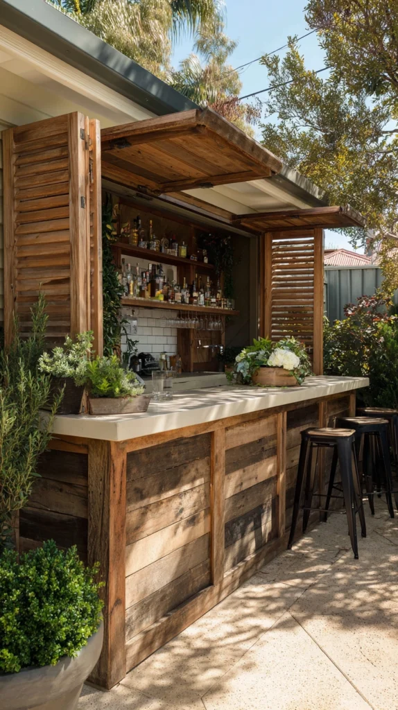 The bar structure itself can be constructed from reclaimed timber, old pallets, or any combination of reclaimed materials that relates to the shutter’s aged character. The entire outdoor bar, from the reclaimed timber frame to the old shutter serving hatch to the distressed timber shelving for bottles and glasses, creates an outdoor entertaining structure of complete material consistency and complete rustic charm.