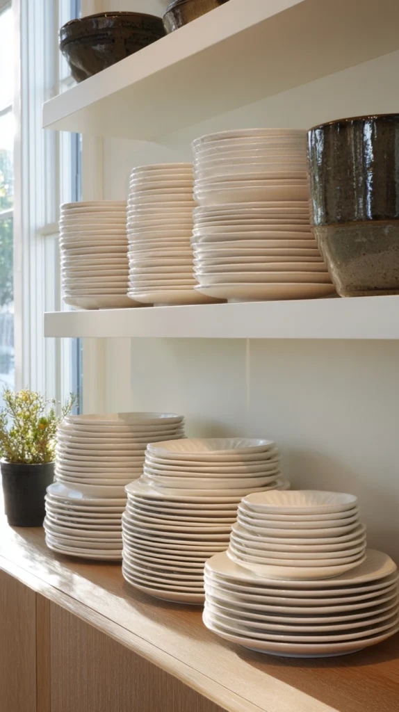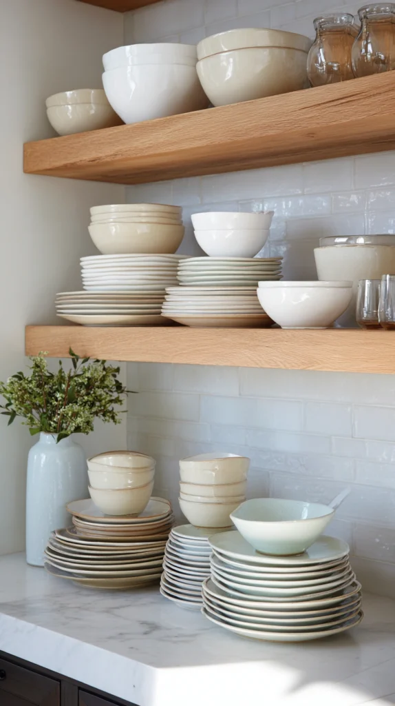 Organize dishes, bowls, and glassware by color to create instant visual cohesion that feels curated rather than chaotic. Stack white plates together, group cream-colored bowls separately, and arrange glassware by type and size.