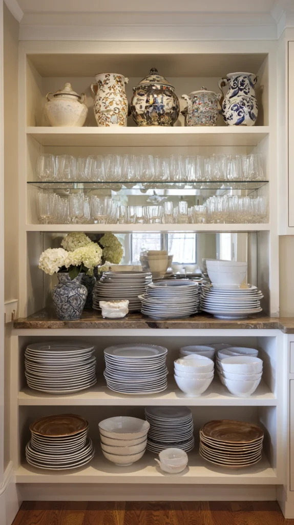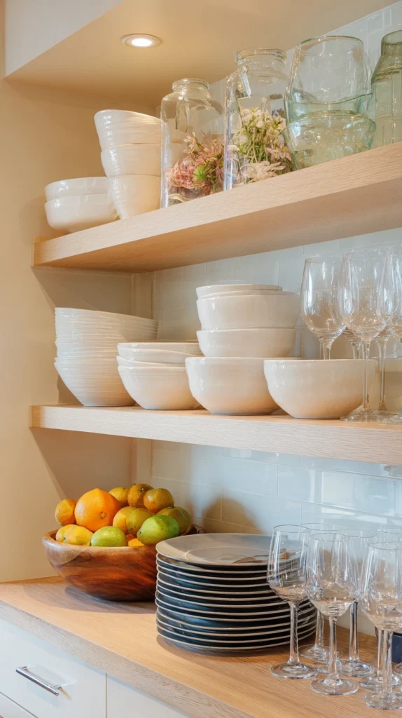 Keep open shelves feeling fresh and clutter-free by rotating items seasonally, displaying only what’s currently relevant. Show bright glassware and lightweight dishes in summer, then swap to earthier pottery and heavier serveware in fall and winter.