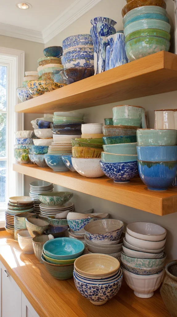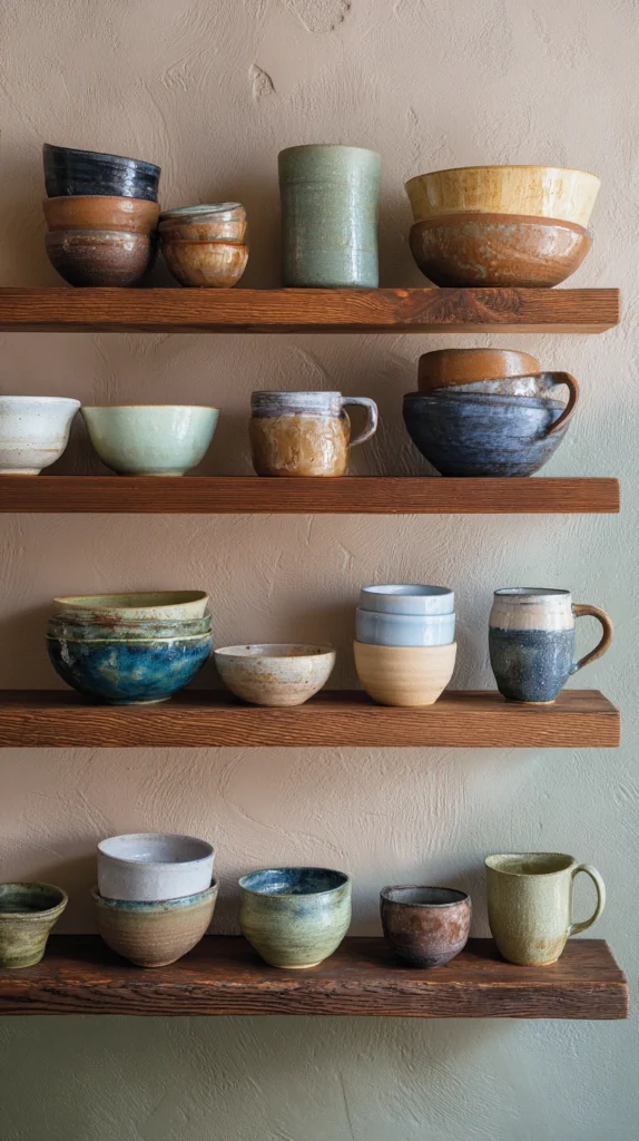 Curate open shelves like an art gallery, displaying only your most beautiful, functional pieces as if they were sculptural objects. Choose items with interesting shapes, beautiful glazes, or compelling forms that deserve to be seen rather than hidden.