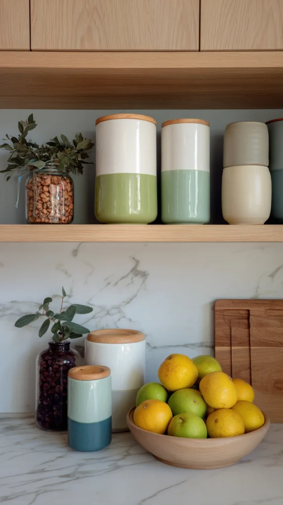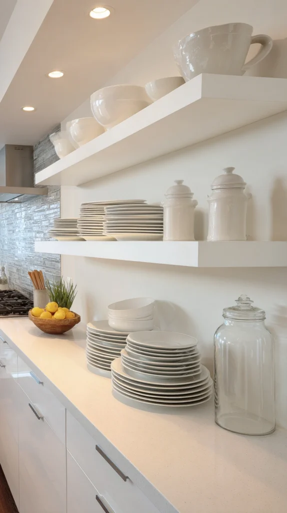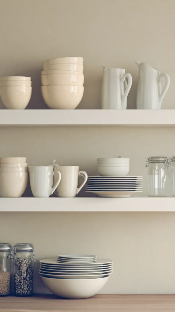 The colors you display on open shelves affect the kitchen’s emotional tone and perceived organization. Whites and creams create calm, spacious feelings while darker tones like charcoal or navy add drama and grounding weight.