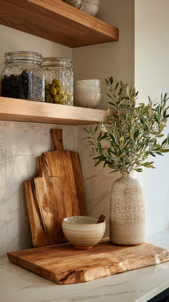 Arrange items at varying heights to create dynamic visual rhythm that’s more engaging than uniform rows. Place tall items like pitchers or vases next to shorter stacks of plates, position cutting boards vertically behind horizontal bowl stacks, or use small risers to elevate certain pieces.