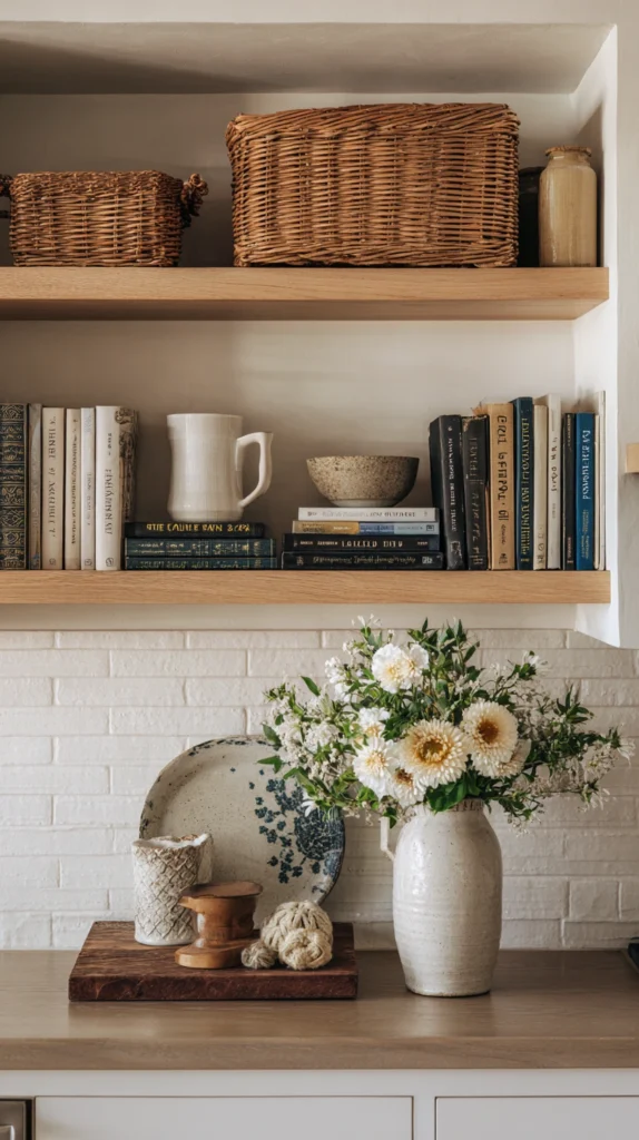 Leave deliberate negative space between groupings to prevent the cluttered appearance that occurs when every inch is filled. The vertical stacking provides surprising capacity while the breathing room maintains the curated aesthetic essential to successful open shelving.