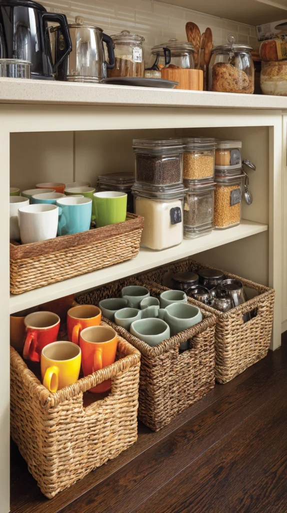 Use attractive baskets, wooden boxes, or ceramic containers to corral smaller items that would otherwise create visual chaos. Store tea bags in a woven basket, keep napkins in a wooden box, or group spices in a ceramic container.
