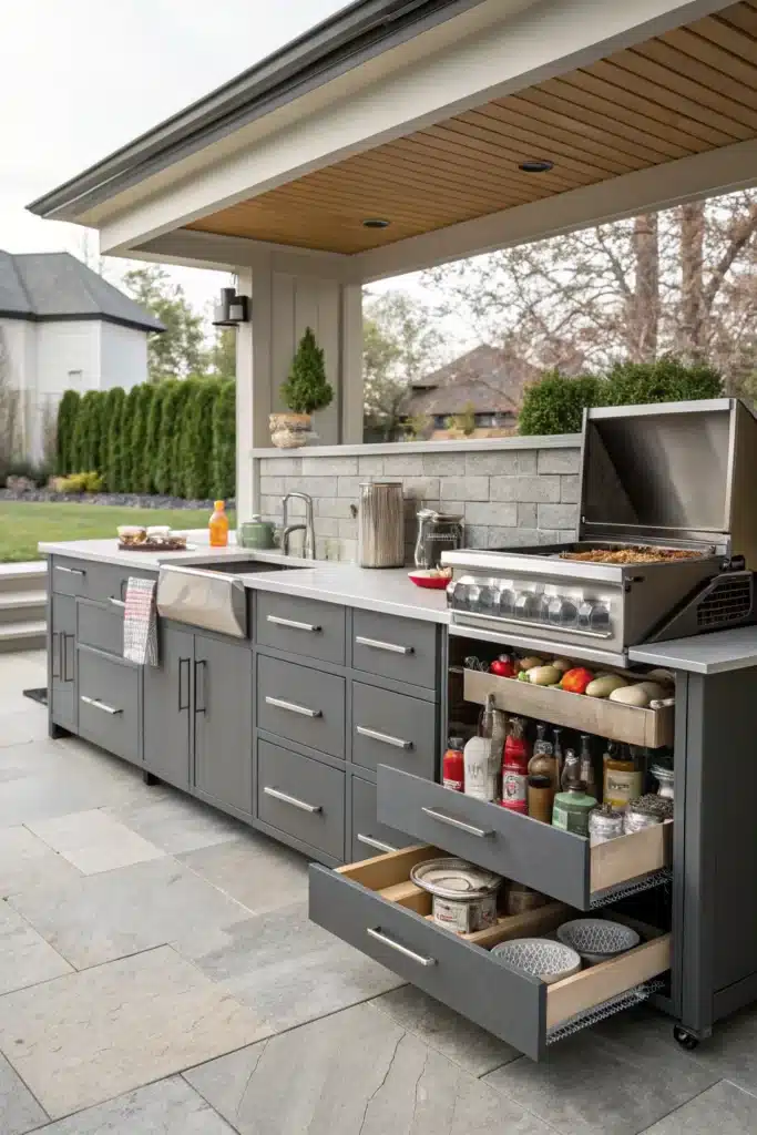 Look for weatherproof cabinets to protect your supplies year-round. A neat outdoor kitchen always feels more inviting.