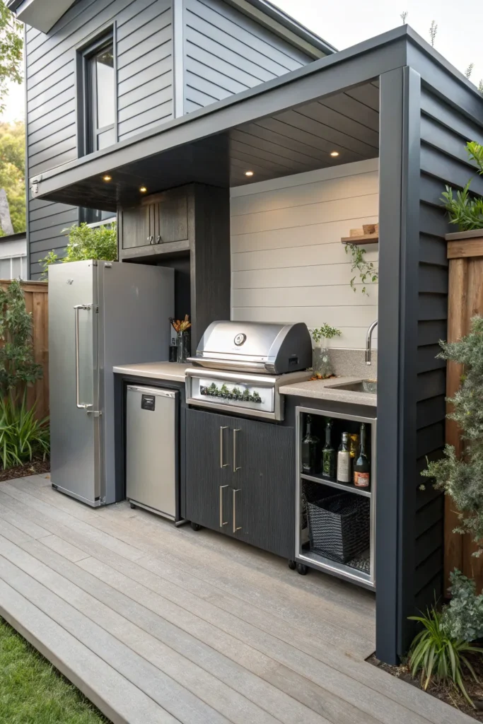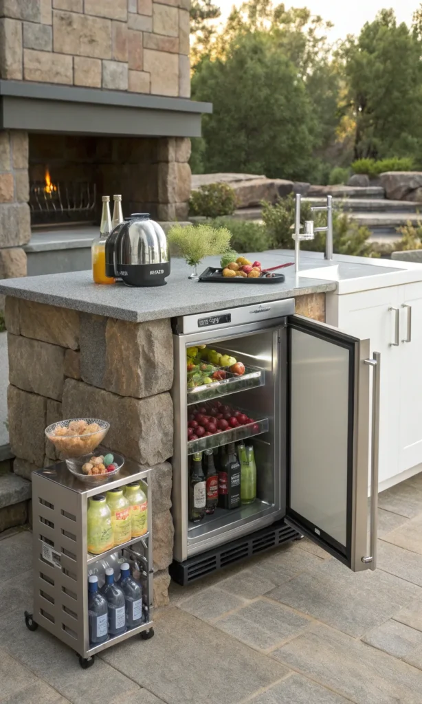 A small outdoor fridge or built-in cooler keeps drinks and ingredients handy. It saves trips inside and keeps the focus on outdoor entertaining.