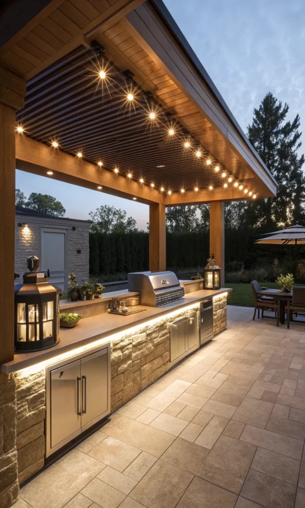 Lighting sets the mood in an outdoor kitchen. Layer overhead lights with under-counter strips and lanterns for balance.