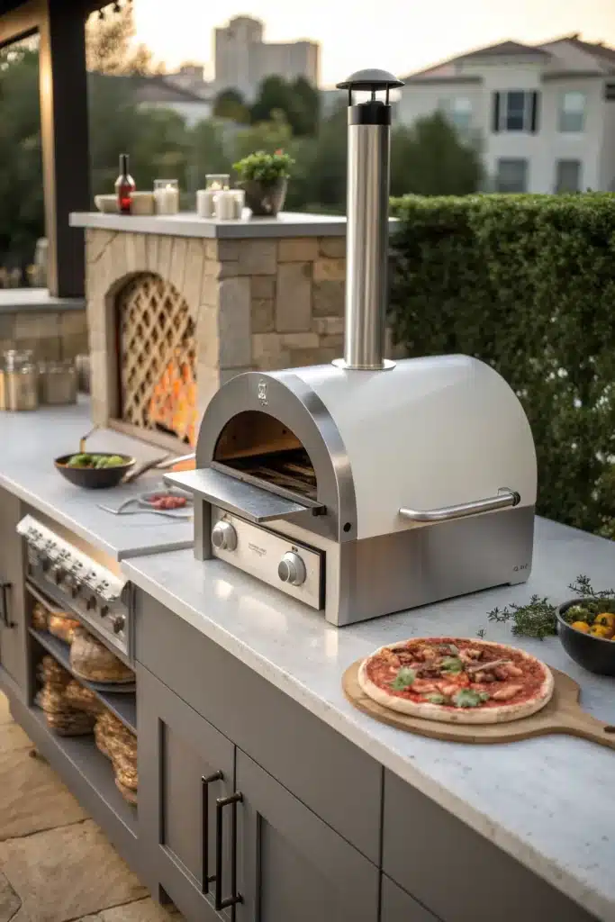 A wood-fired pizza oven adds fun and flair to an outdoor kitchen. It’s perfect for casual gatherings and creates a rustic focal point.