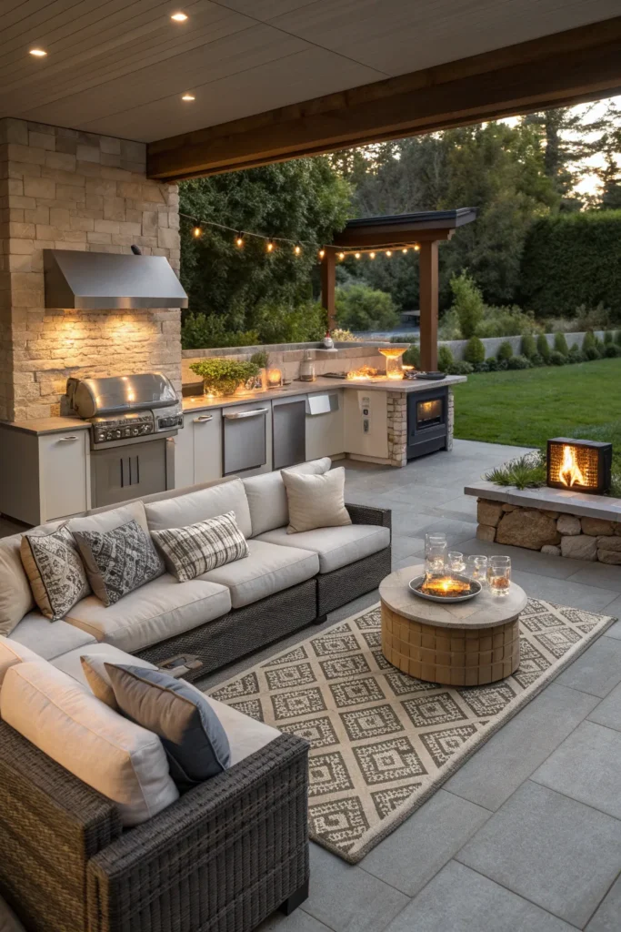 Pair your kitchen with a lounge space—sectional seating, outdoor rugs, and a fire pit nearby. It creates a natural flow from cooking to relaxing.