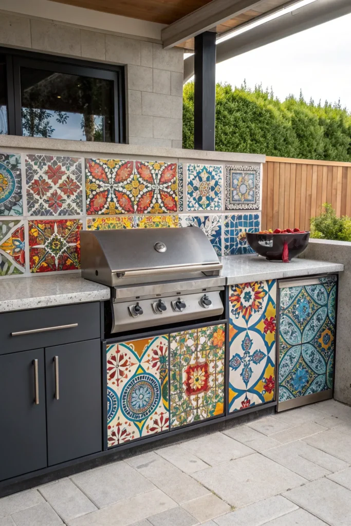 A colorful tile backsplash behind the grill or sink adds personality and style. Patterns in Moroccan, geometric, or coastal styles create a statement piece.
