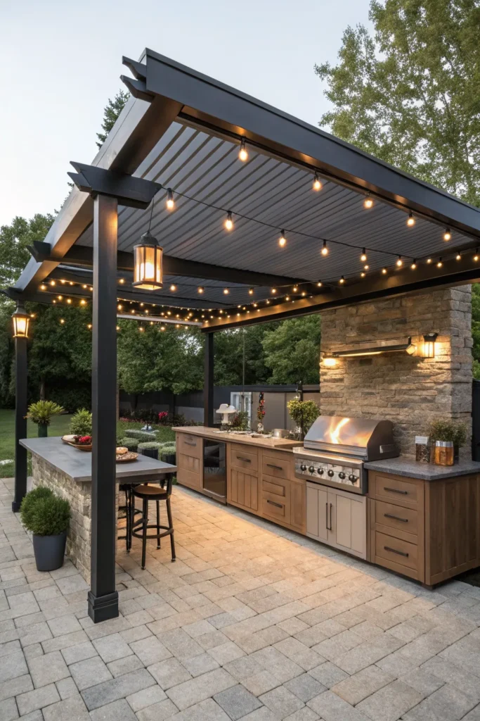 Covering your outdoor kitchen with a pergola instantly makes it feel more like a room. It adds shade, defines the space, and looks stylish in wood or metal finishes.