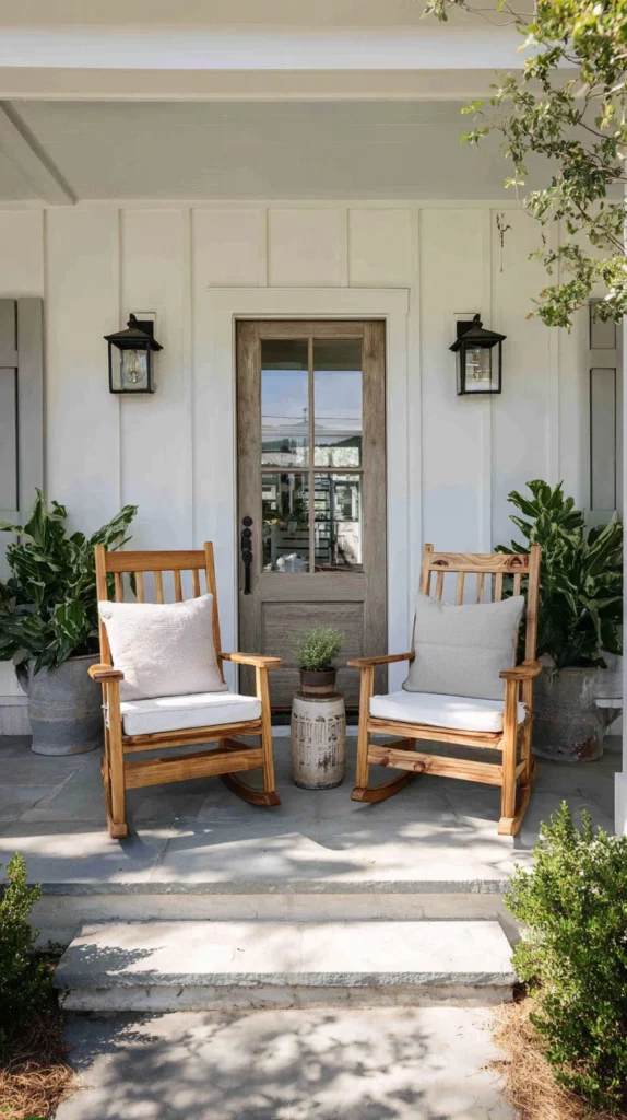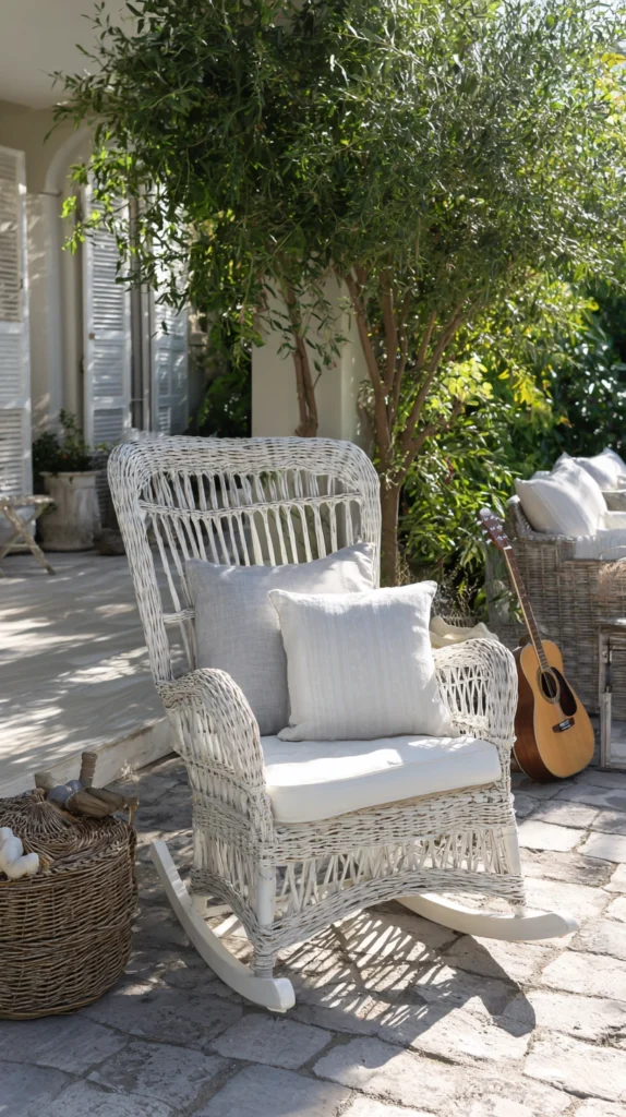 Create sophisticated restraint through exclusively neutral styling using white, cream, gray, or natural wood tones throughout rockers, cushions, and surrounding accessories establishing calm elegant presentations. Choose rockers in natural wood finishes or painted whites maintaining the neutral palette, add cushions in coordinating neutral fabrics creating tonal variation through texture rather than color, and accessorize with neutral-toned plants, lanterns, or decorative objects.