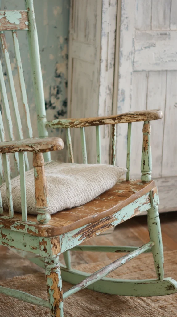 Apply or source rockers featuring vintage-inspired painted finishes in colors like turquoise, coral, mint green, or butter yellow creating cheerful personality and cottage charm through unexpected colorful statements. Paint wooden rockers in bold cheerful colors using exterior-grade paints ensuring longevity, distress painted finishes revealing wood beneath suggesting age and character, or source genuinely vintage painted rockers from antique markets.
