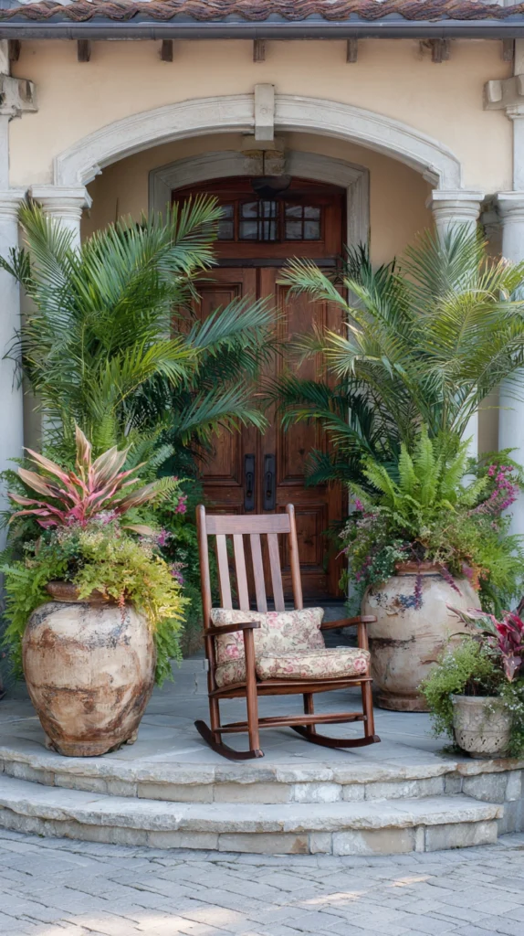 Choose planters in materials and styles coordinating with rockers and overall porch aesthetics, fill with seasonal flowers, lush foliage plants, or evergreen specimens providing year-round presence, and ensure adequate size making genuine visual impact without overwhelming rocker scale. The flanking plants create balanced compositions while the greenery adds natural beauty and establishes rockers within designed outdoor settings rather than isolated furniture placement.