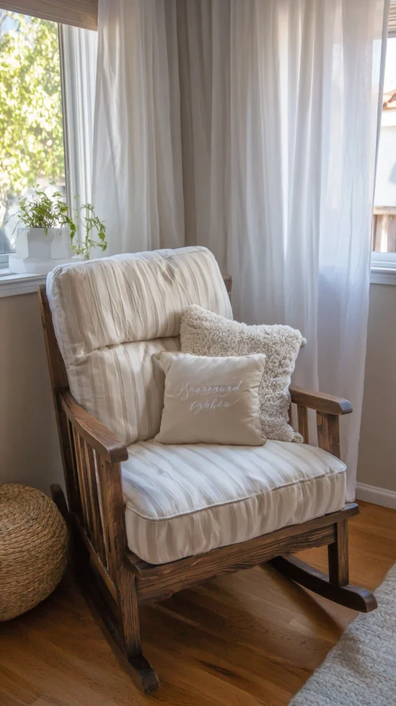 Add charming personalized details through custom name plaques, monogrammed cushions, or decorative signs making rockers feel specially designated and adding individual character beyond generic styling. Commission wooden name plaques reading “Grandma’s Chair” or family names creating sentimental touches, order monogrammed cushion covers featuring family initials, or hang small decorative signs near rockers with welcoming messages or family mottos.