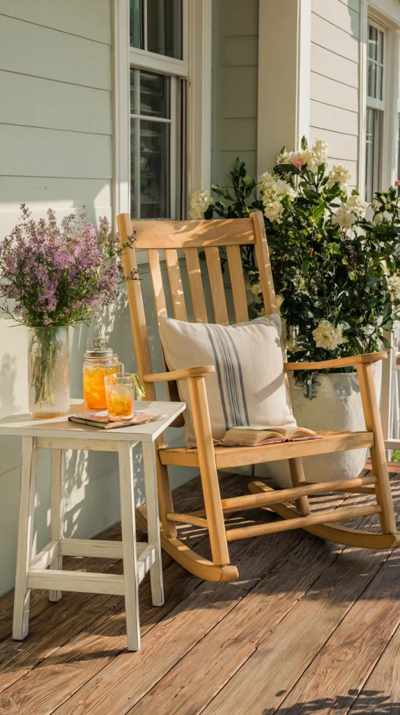 Choose weather-resistant tables in materials coordinating with rocker styles whether that’s natural wood, metal, or woven materials, ensure appropriate heights allowing easy reach from seated positions, and select tables with adequate surface area without overwhelming compact porch spaces. Style tabletops with small potted plants, decorative lanterns, or simply keep clear maintaining functional surface availability. The table additions dramatically improve rocker usability making them practical for actual extended outdoor time rather than brief decorative sitting.
