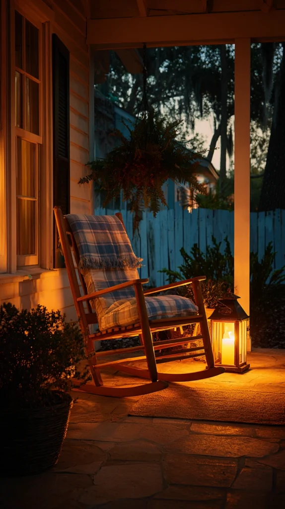 Create evening atmosphere by positioning decorative lanterns near rockers providing gentle illumination that extends outdoor enjoyment past sunset while adding decorative interest during daylight hours.