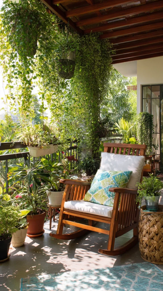Frame rockers with hanging plants suspended from porch ceilings creating living green backdrops and establishing rockers within designed outdoor moments rather than isolated furniture placement. Choose trailing plants including petunias, ivy, or ferns creating cascading effects, use hanging baskets in materials coordinating with rocker styles, and position where plants won’t interfere with rocking motion or drip onto seated occupants.